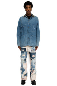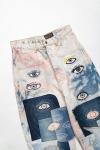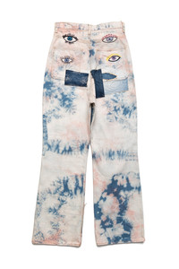 - Color: Indigo x Pink - Distressed and patchwork of various denim fabrics, and embroidery - Baggy flare fit - Zipper fly - One wash - 100% Cotton - Please note that there are individual differences. - Any tears or damage caused by processing are intentional in the design and are not product defects. - Made in Japan - Model is 6'2" wearing a size 32