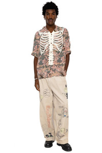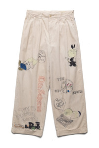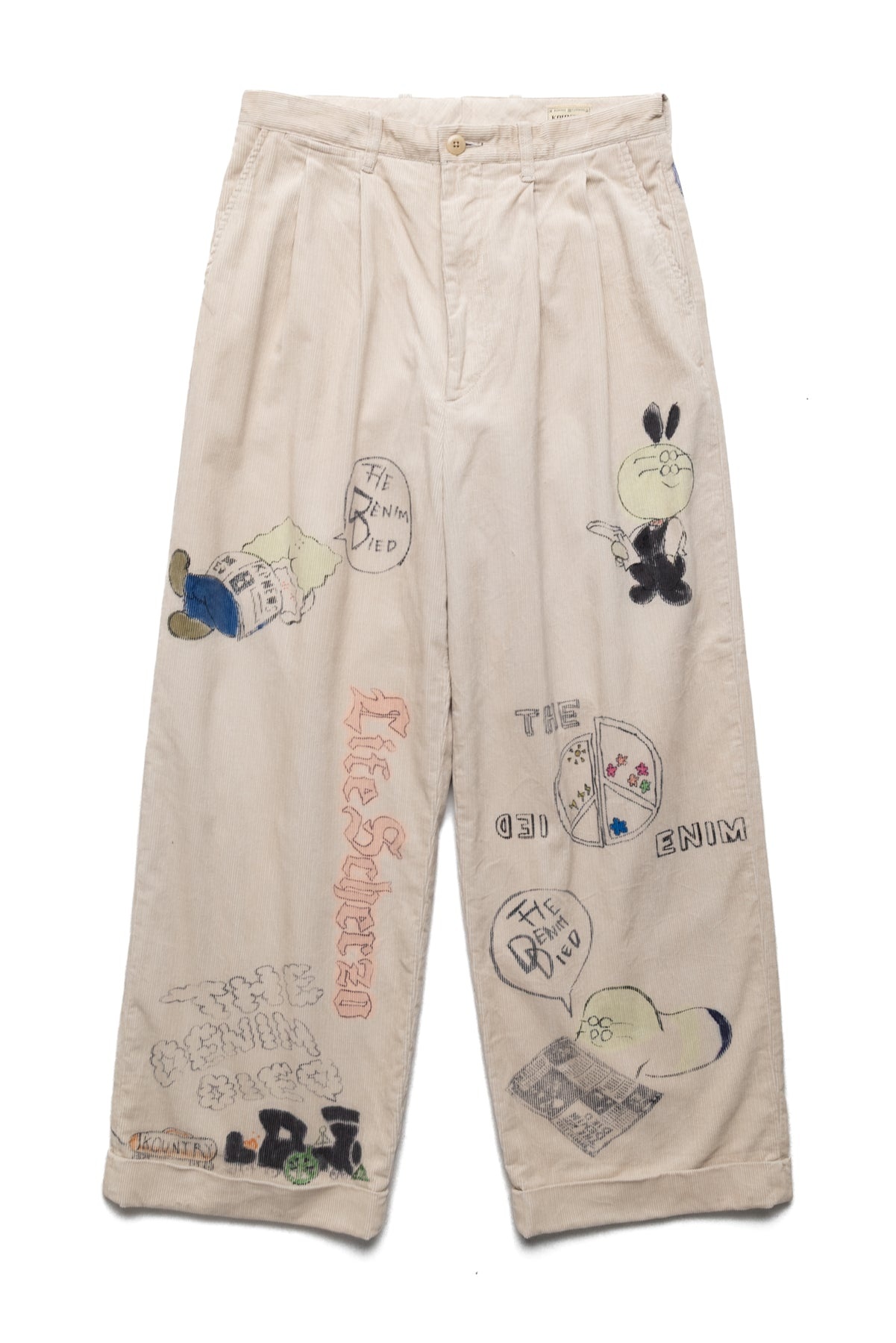 - Corduroy pants with memorial painting. - Drawing, dye mixing, coloring, stamping, etc. are all done by hand by KOUNTRY craftsmen. - Roomy silhouette with two tucks on the front - Color: Beige - 100% cotton - Waist lining: 75% cotton, 23% linen, 2% polyester - Made in Japan - Individual differences may occur - Tears and damage caused by processing are the design intent and are not product defects - Model is 6'2 wearing a size 3