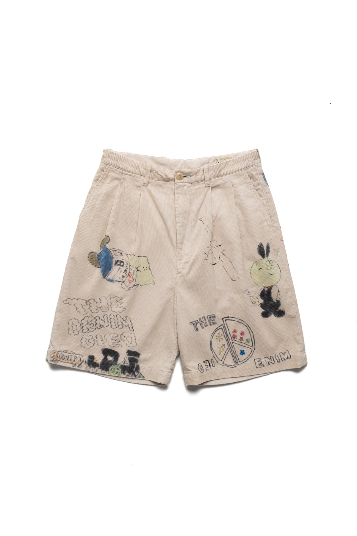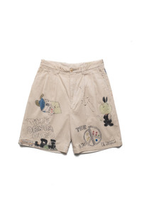 - Shorts with memorial painting. - Drawing, dye mixing, coloring, stamping, etc. are all done by hand by KOUNTRY craftsmen. - Roomy silhouette with two tucks on the front - Color: Beige - 100% cotton - Waist lining: 75% cotton, 23% linen, 2% polyester - Made in Japan - Individual differences may occur - Tears and damage caused by processing are the design intent and are not product defects - Model is 6'2 wearing a size 3