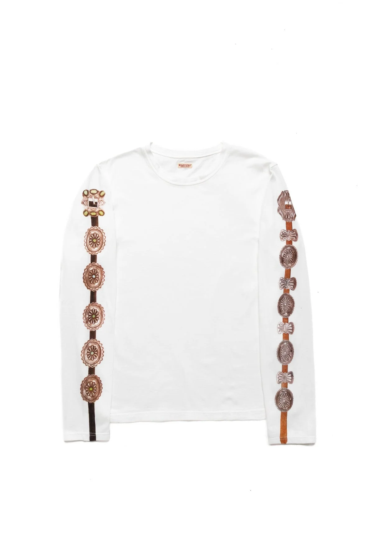 - A crew long tee featuring concho belt prints on both sleeves. - 100% Cotton - Color: White - Made in Japan - There are individual differences in print range and color. - Model is 6'2 wearing a size 2