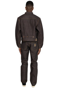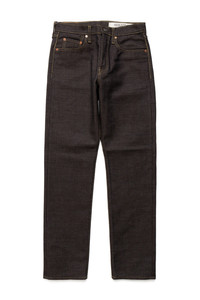 - Color: No.5-S / Kakishibu (Persimmon) x Indigo - Fabric: Kakishibu Dyed Denim With Indigo Sashiko - 100% Cotton - Mid Rise Regular Straight Fit - Cinched Back - Button Fly - Unwashed Sanforized Denim, 3% Shrinkage - Made In Japan - Model is 6'3" wearing size 36 • Measurements of Actual Garment in Inches: