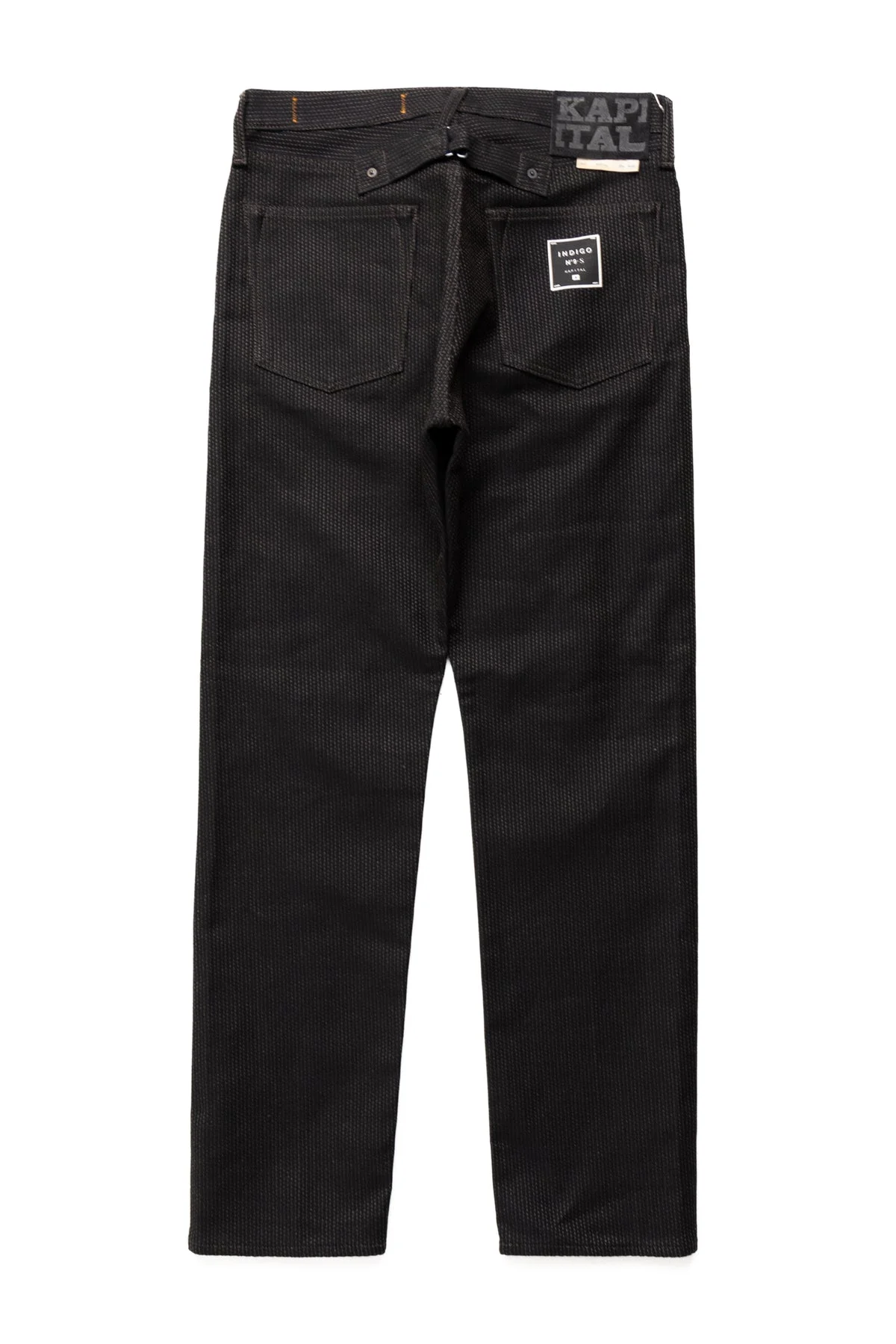 • Kapital No. KAP-201Century Denim No.9 5P MONKEY CISCO - Deep brown sashiko denim - Mud dyed in Omami Oshima. Natural dyeing method that is practiced only in Amami Oshima - Linen sashiko yarn - Black sashiko thread is dyed with the Amami Oshima traditional dyeing technique through a precise process by artisans - Cinched Back - Button Fly - Unwashed Sanforized Denim, 3% Shrinkage - 100% Cotton - Made In Japan • Kapital No. KAP-201Century Denim No.9 5P MONKEY CISCO Measurements of Actual Garment in Inches: