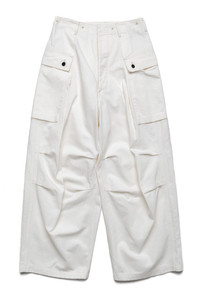 - Herringbone loose-fit monkey pants. - Capacious cargo pockets are attached to both sides and hips. - Front and back waist holes for suspenders. - Button fly - Color: White - 100% Cotton - Made In Japan