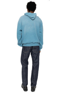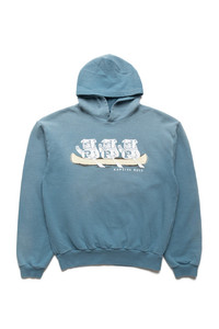 - Print of a bulldog paddling a canoe wearing a "P" letter sweater. - Color: Turquoise - 100% Cotton - Made In Japan - Tears and damage caused by processing are part of the design and are not considered product defects. - Model is 6'2 wearing a size 3