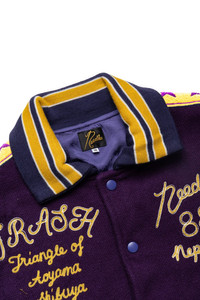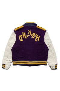 - Color: Purple - Heavy wool melton - Embroidered with "REASH," reflecting this season's theme - 100% wool - Sleeves: Cowhide - Made in Japan - Model is 6'2 wearing a size M