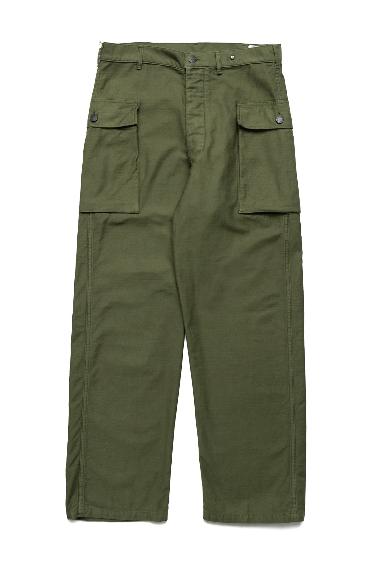 2 Pocket Cargo Pants In Reverse Sateen version for Blue in Green The orSlow original reverse sateen is carefully selected from the spinning stage and dyed using a special dyeing method. Through repeated washing and wearing, it will develop an aging effect similar to vintage clothing. - Blue in Green Exclusive - Garment dye - Loose fit - Blue in Green tag is sewn inside of a pocket - 2 pockets on both legs - Button fly - Color: Army Green - 100% cotton - Made In Japan - Model is 6'2 wearing a size 3