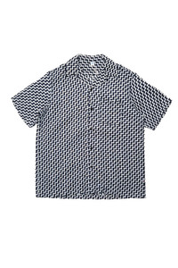 A short sleeve indigo open collar shirt with a pattern created with jacquard weaving.The "saw" pattern features a jagged mountain pattern reminiscent of a saw blade.In addition, the indigo fades with repeated washing and wearing, making it more tasteful and expressive. The open collar and slightly boxy, loose silhouette make it comfortable to wear even in the summer. - Color: Indigo with saw pattern - Open Collar - Slightly boxy with loose silhouette - Straight Hem - 100% Cotton