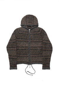 The Fair Isle felted knit zip-up hoodie is crafted from a warm wool blend, combining virgin wool, acrylic, and polyester for a soft yet structured feel. Designed with a relaxed silhouette, it includes an adjustable hood and hem with tonal drawcords for personalized styling. A sturdy metal front zip adds a utilitarian edge, balancing traditional design with functionality. - Relaxed Silhouette - Made in Italy