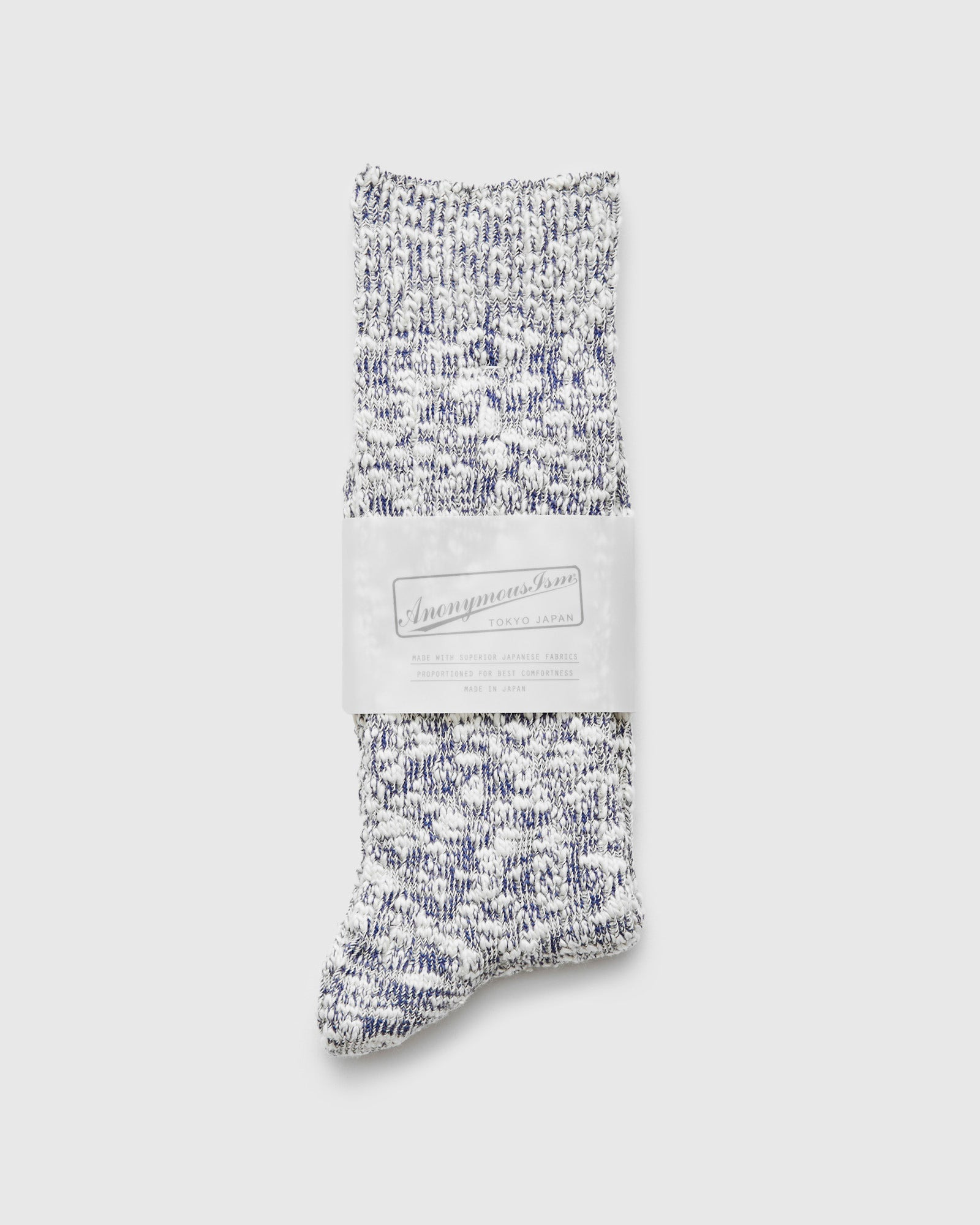 The "Light Slub Crew" series from AnonymousIsm signature slub socks with a minimalist textured design. Woven using a slub weave yarn, the socks sport a tubular construction with ribbed knitting. Each pair of AnonymousIsm socks are expertly crafted by their team in Tokyo, Japan. - Low gauge pile weave - 66% Cotton 28% Acrylic 5% Polyester 1% Spandex - Made in Japan One size. Fits US 9-12.
