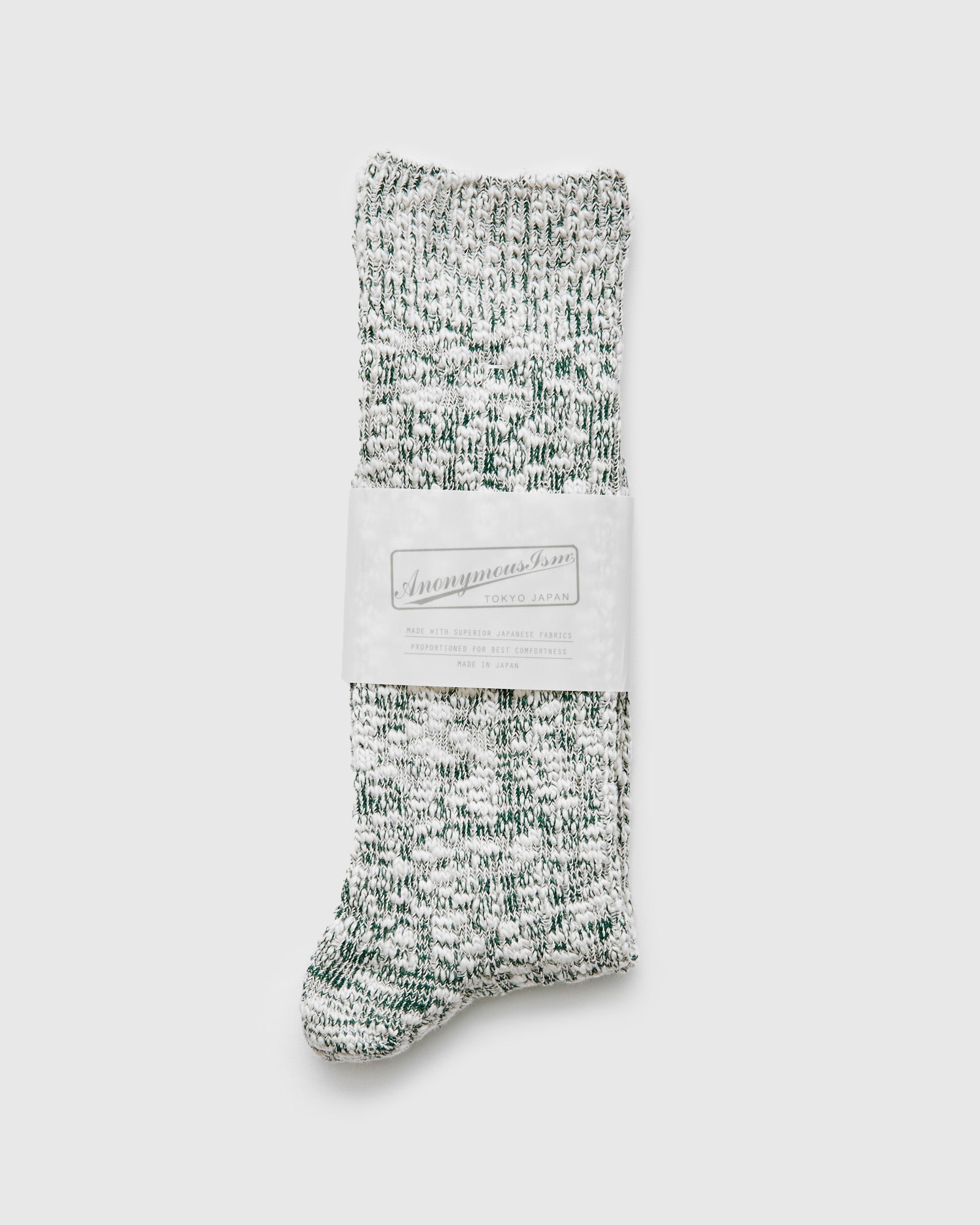 The "Light Slub Crew" series from AnonymousIsm signature slub socks with a minimalist textured design. Woven using a slub weave yarn, the socks sport a tubular construction with ribbed knitting. Each pair of AnonymousIsm socks are expertly crafted by their team in Tokyo, Japan. - Low gauge pile weave - 66% Cotton 28% Acrylic 5% Polyester 1% Spandex - Made in Japan One size. Fits US 9-12.