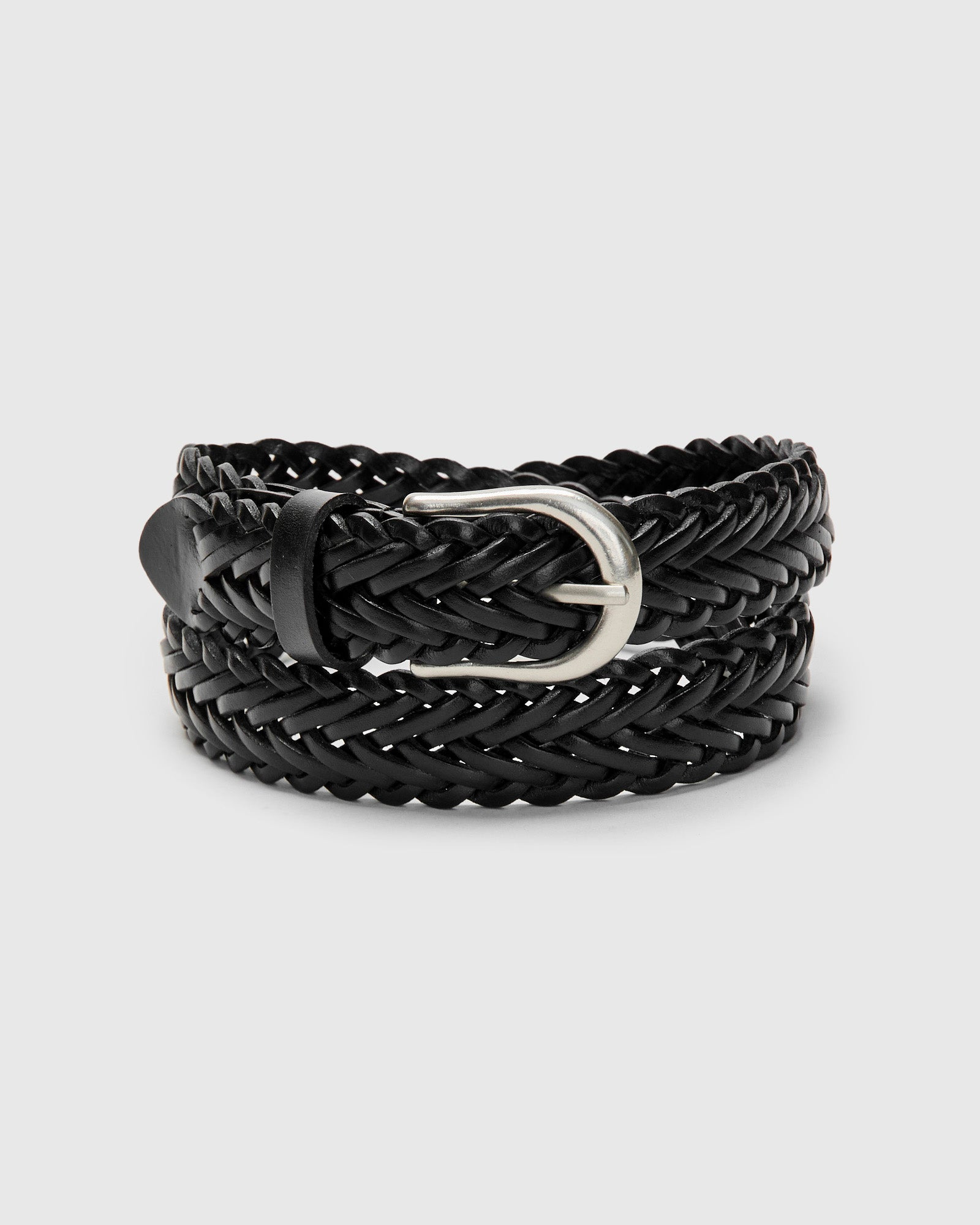 - Cowhide leather - 3cm width - Woven construction - Custom brass buckle - Hand-stitched detailing - Made in China