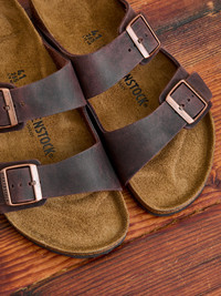 An outdoor staple for nearly 50 years, the Arizona is Birkenstock's signature sandal, featuring a dual strap upper and proprietary 'Birkengrip' outsole. This iteration boasts an oiled nubuck leather upper, a lightweight EVA midsole, and heavy-duty double prong brass buckles. Fitted with the brand's suede-lined, anatomically shaped cork footbed, these sandals are designed to mold to the wearer's feet over time, providing a custom-tailored fit. - Oiled habana nubuck leather - Suede-lined anatomically shaped cork latex footbed - Lightweight EVA midsole - Anti-slip 'Birkengrip' outsole - Single prong brass buckle - Made in Germany