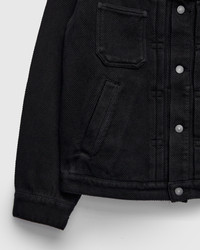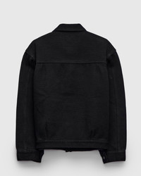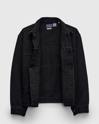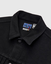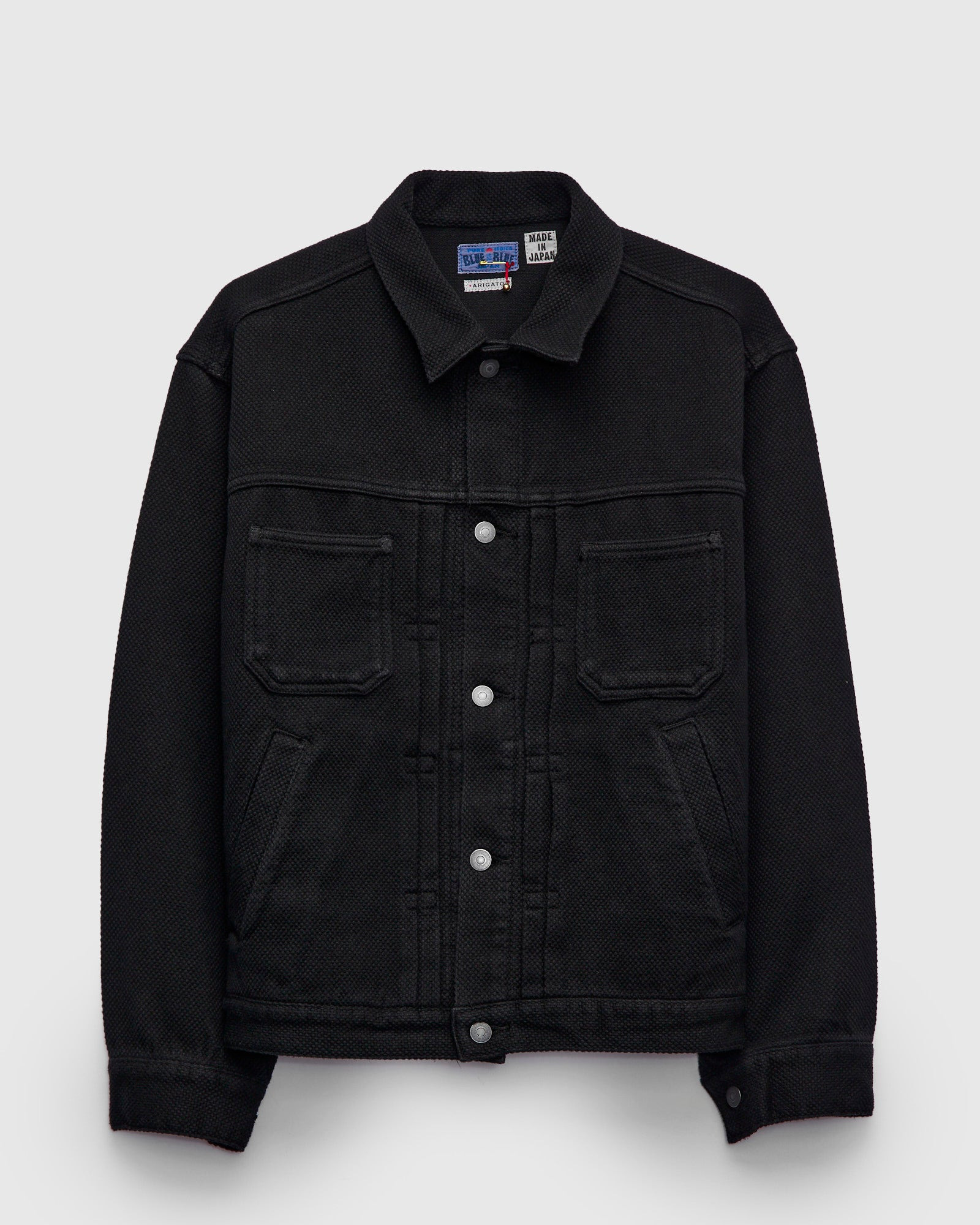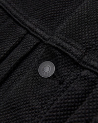 This hand-dyed trucker-style jacket from Blue Blue Japan offers a traditional Japanese sashiko fabric in a familiar workwear style. Renowned for its exceptional durability and history in martial arts, the Double Cloth Sashiko fabric sports a substantial feel and loosely-woven texture. The jacket is hand-dyed a deep black color, yielding soft solid tone that will patina with wear and flourish with age. Fitted with traditional workwear-style detailing, and convenient hand pockets at the waist. - Regular fit - Medium-weight Japanese sashiko fabric - Aged copper buttons - Two button chest pocket - Two hand pockets at waist - 100% cotton - Made in Japan