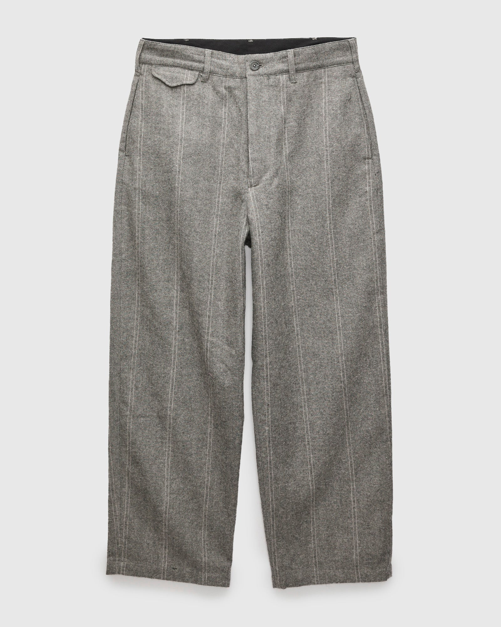 The Officer Pant is Engineered Garments’ wide-leg trouser, drawing inspiration from slant pocket trousers worn by U.S. Naval officers during World War II. This version is cut from a medium-weight striped herringbone twill, woven from an acrylic-wool blend with a brushed texture and soft hand. Designed with utility in mind, the pants feature slant front pockets, rear flap pockets, an adjustable drawstring waistband, and a concealed coin pocket. - Wide-leg fit - Medium-weight striped herringbone twill - Slant front pockets - Rear flap pockets - Drawstring waistband - Zipper fly - 20% wool 35% polyester 40% acrylic 5% other - Made in New York, USA