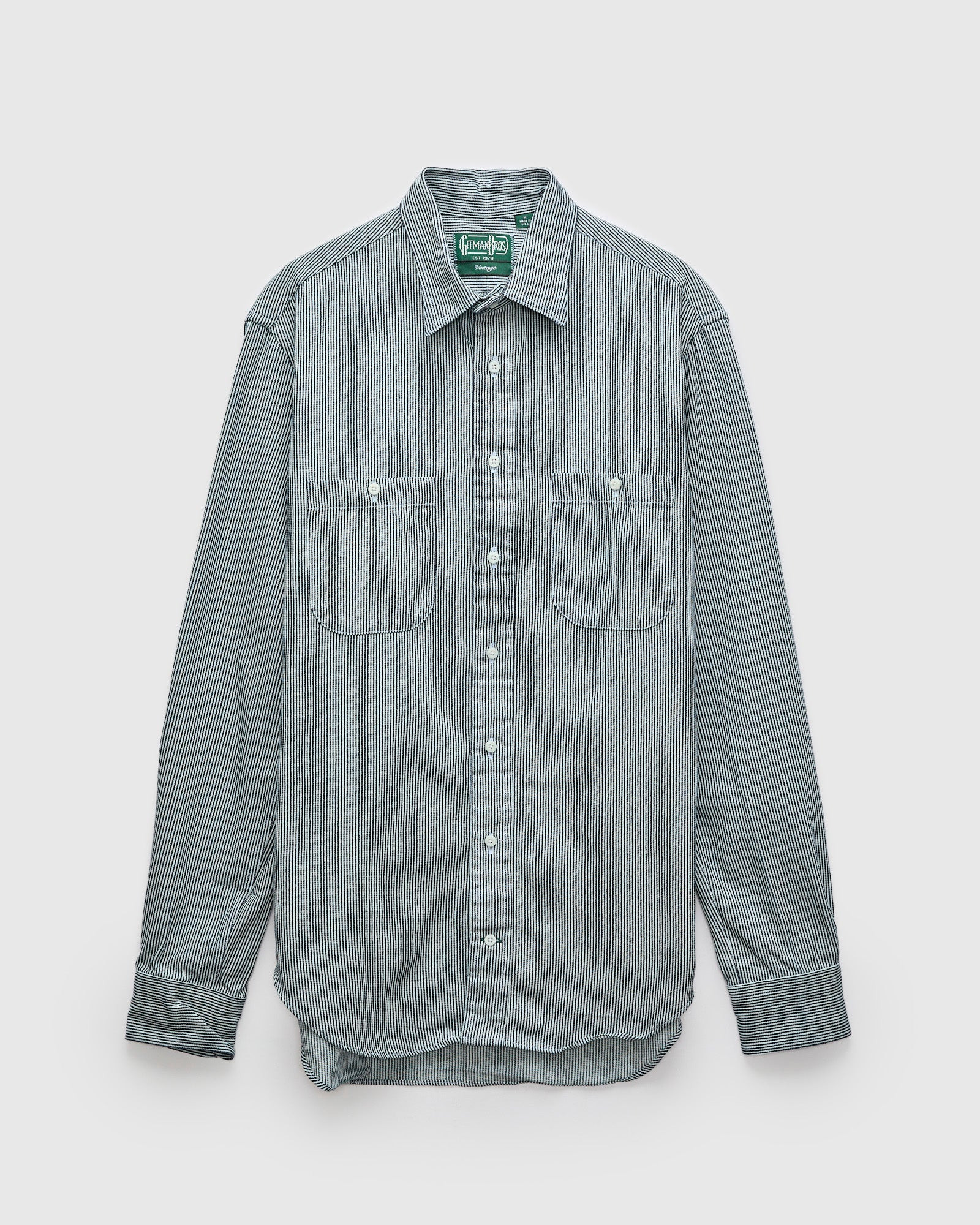 This work shirt from Gitman Vintage is sewn at the brand’s Ashland, Pennsylvania factory using a 7oz Japanese striped denim fabric. Combining American craftsmanship with Japanese textiles, the shirt applies Gitman’s shirting expertise to a classic utility silhouette. Details include two button-through chest pockets, reinforced barrel cuffs, thick chalk buttons, and a locker loop at the nape. - Regular fit - 7oz Japanese hickory stripe denim - Point collar - Locker loop at back - Dual button-through chest pockets - Reinforced barrel cuffs - 100% cotton - Made in USA