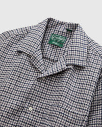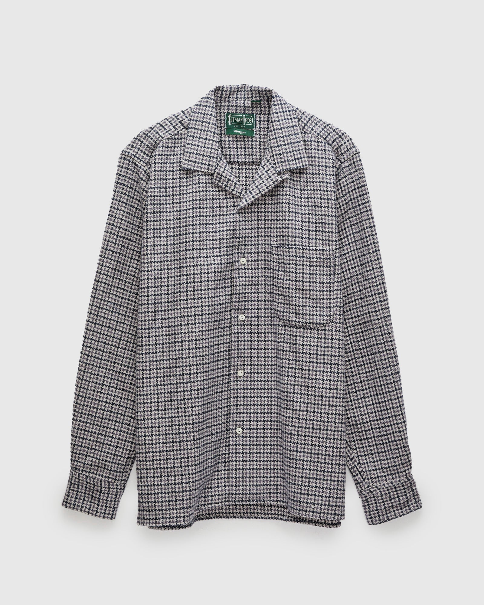 This button-up shirt from Gitman Vintage is made in the USA from a soft brushed houndstooth fabric. The shirt sports a textured, warm appearance with the depth and character typical of the brand's signature shirting. The camp shirt style features a relaxed fit, open collar, and straight hem cut designed for a more casual look. - Relaxed body, straight hem - Brushed cotton houndstooth fabric - Open collar design - Front chest pocket - Reinforced cuffs and collar - 100% cotton - Made in USA