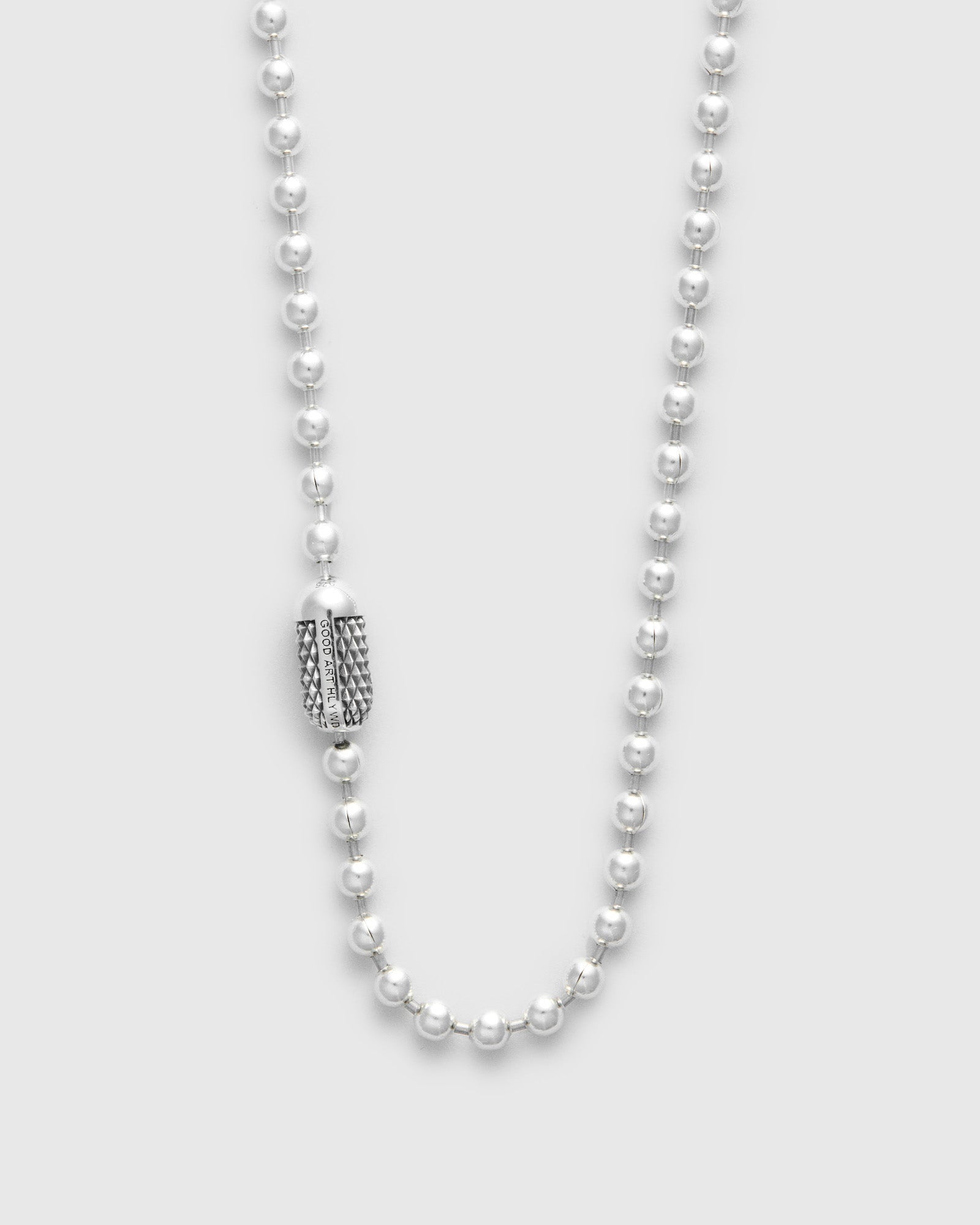 Good Art's Ball Chain is a refined take on the classic Americana accessory. Cast and finished entirely by hand, this chain has become a staple of Good Art's collection. This iteration features a custom-made spring loaded poplock closure, with Good Art's "Goosebumps" motif, also made in house at their Los Angeles Foundry. - Goosebumps poplock clasp - Size A Ball Chain, 4.5mm width - .925 Sterling Silver - Made at the Good Art HLYWD Foundry in Los Angeles, CA Can be cut to shorter lengths.