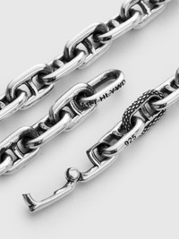 Good Art's tried and true Anchor Chain the Model 22 is a testament to heavy-duty craftsmanship revamping the ubiquitous mariner design. All metals are mixed, cast, soldered, cut, tested and assembled at the brands Los Angeles Foundry allowing the brand it's signature eye for detail. Decorated with a single Goosebumps link with each piece undergoing a sulphuric acid and hand-burnishing process, imparting a blackened contrast to the polished sterling silver. - Size AA chain - Chain individually linked and welded - Model 22 anchor link locking clasp - Goosebumps link - Good Art logo on clasp - .925 Sterling Silver - Made at the Good Art HLYWD Foundry in Los Angeles, CA - Includes Bill of Authenticity To determine your size, measure your wrist with flexible measuring tape snugly around the lower portion of your wrist. Email us at service@blueowl.us with any questions.