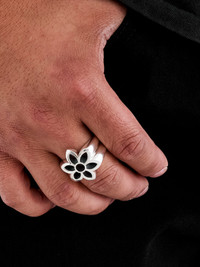 The Model 28 ring features a heavyweight design centered around Good Art's signature rosette motif. The ring features a double concave on the exterior shank with a contoured cutout at the head. Hand cast entirely in .925 silver, the ring is finished and polished to perfection at their Los Angeles Foundry. - Cutout rosette head - Dual concave shank exterior - .925 Sterling Silver - Made at the Good Art HLYWD Foundry in Los Angeles, CA - Includes Bill of Authenticity Sizing is standard US sizing