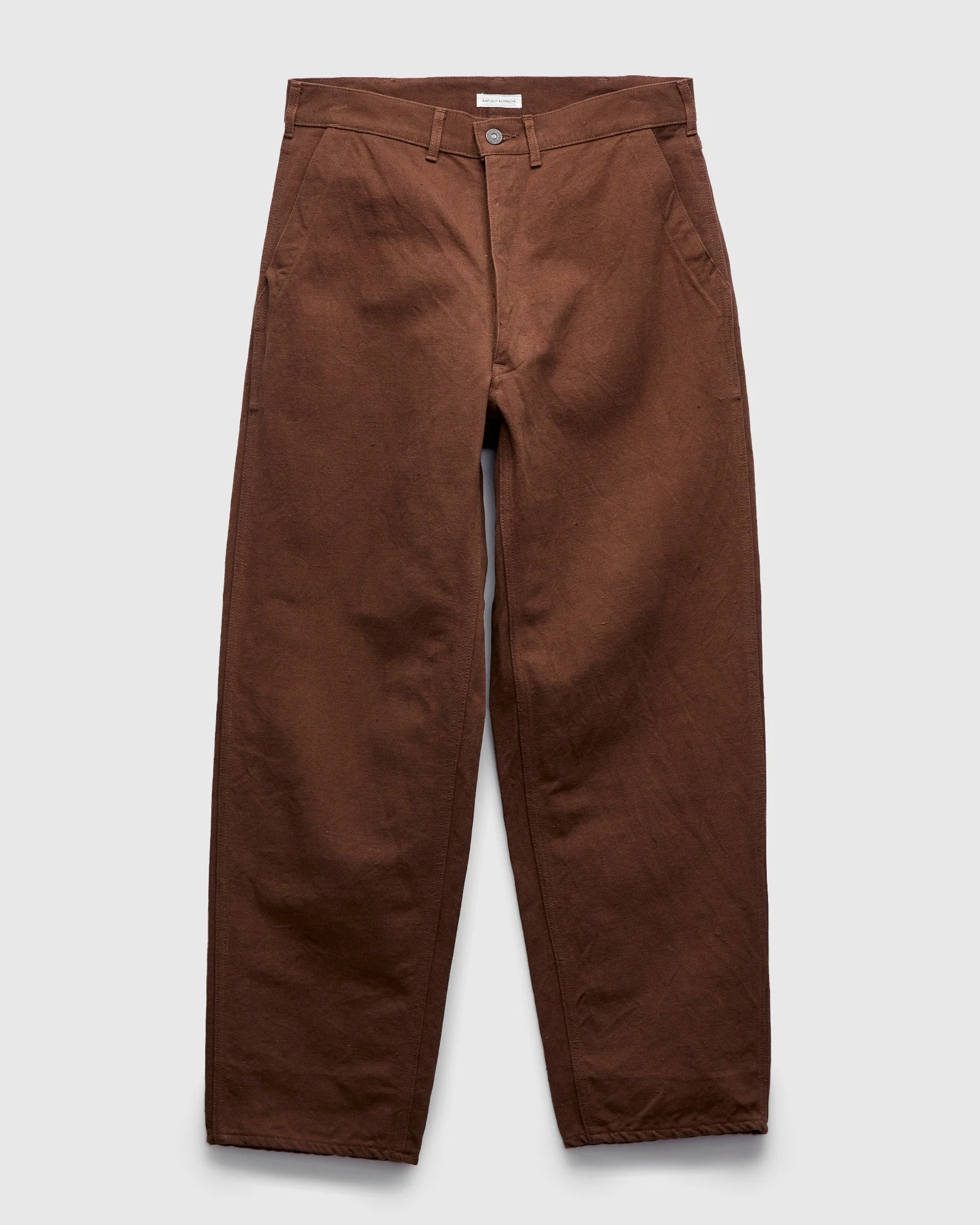 Kaptain Sunshine's Painter Pants are crafted from a heavyweight oxford fabric, densely woven using cotton yarn at the warp and thick hemp at the weft. The result is a hard-wearing fabric with a varied surface texture and breathable weave. Dyed a deep rust-brown using Kakishibu tannins, the pants have undergone a rinse process to bring out the fabrics texture and reduce shrinkage. Fitted with canvas pocket bags, metal button fly, and large patch pockets at the rear. - High rise, straight leg with minimal taper - Heavyweight Japanese oxford fabric - Kakishibu tannin dye - Rinse treatment - Slant waist pockets - Rear patch pockets - Metal button fly - 54% cotton 46% hemp - Made in Japan