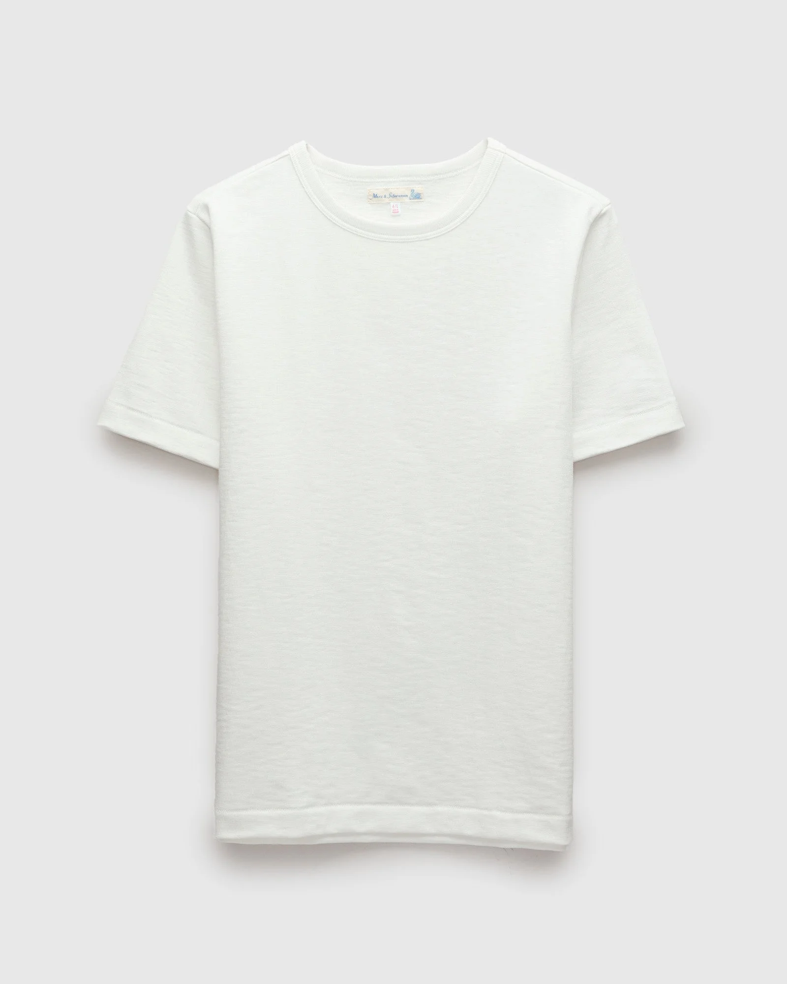Merz b. Schwanen’s heaviest loopwheel T-shirt. The 2S14 Super Heavyweight tee is made in Germany on rare loopwheel knitting machines using thick organic cotton slub yarns. Weighing in at a substantial 10.7oz, the shirt offers an ultra-dense yet surprisingly comfortable feel. Finished with a reinforced ribbed collar, triangle underarm inserts, and a single-stitch hem. - Relaxed fit - 10.7oz loopwheel slub jersey 2-thread fabric - Fabric will shrink 1–1.5" with the first wash - Ribbed collar - Triangular underarm inserts - Crafted without side seams - 100% organic cotton - Made in Germany - Style #2S14 Note: This tee is unwashed and will shrink slightly in length after the first wash. We recommend sizing up one size from your typical American t-shirt size for a relaxed fit, or taking your regular size for a closer fit. For personalized assistance, contact sales@blueowl.us or consult our sizing chart below.