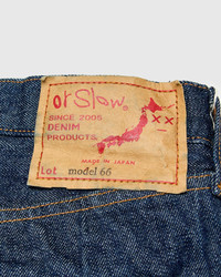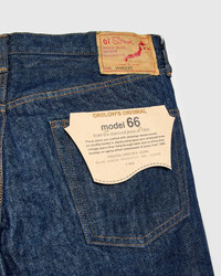 Inspired by an iconic denim model of 1966, orSlow's Model 66 denim is cut from a 14oz Japanese denim fabric that has undergone a pre-soak treatment for a softer feel. Meticulously modeled after vintage jeans, the fabric sports a slightly more rigid texture than the brand's standard denim, with key details like the paper waist patch and branded copper rivets. Presented in the same straight-leg silhouette as orSlow's best-selling 105 Selvedge Denim. - 14oz one-wash Japanese selvedge denim - orSlow's straight fit features a roomy top block and classic straight profile down the leg - Vintage style paper waist patch - Custom branded copper rivets - Button fly - White and beige selvedge - 100% cotton - Made in Japan - Style #01-1056