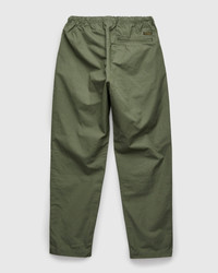 The New Yorker pants from orSlow are easy-to-wear casual trousers with an elastic waistband. This installment utilizes a deadstock ripstop fabric, complete with elongated drawstring fastening for a military-inspired aesthetic. The pants feature three pockets in total and a relaxed top block with a sleek taper down the leg. - Deadstock military ripstop fabric - Elastic waistband with elongated drawstring - YKK zipper fly with custom branded snap button - Bartack reinforcements - Cropped length - 100% cotton - Made in Japan Model is 5'10' and 180lbs wearing a size 2.