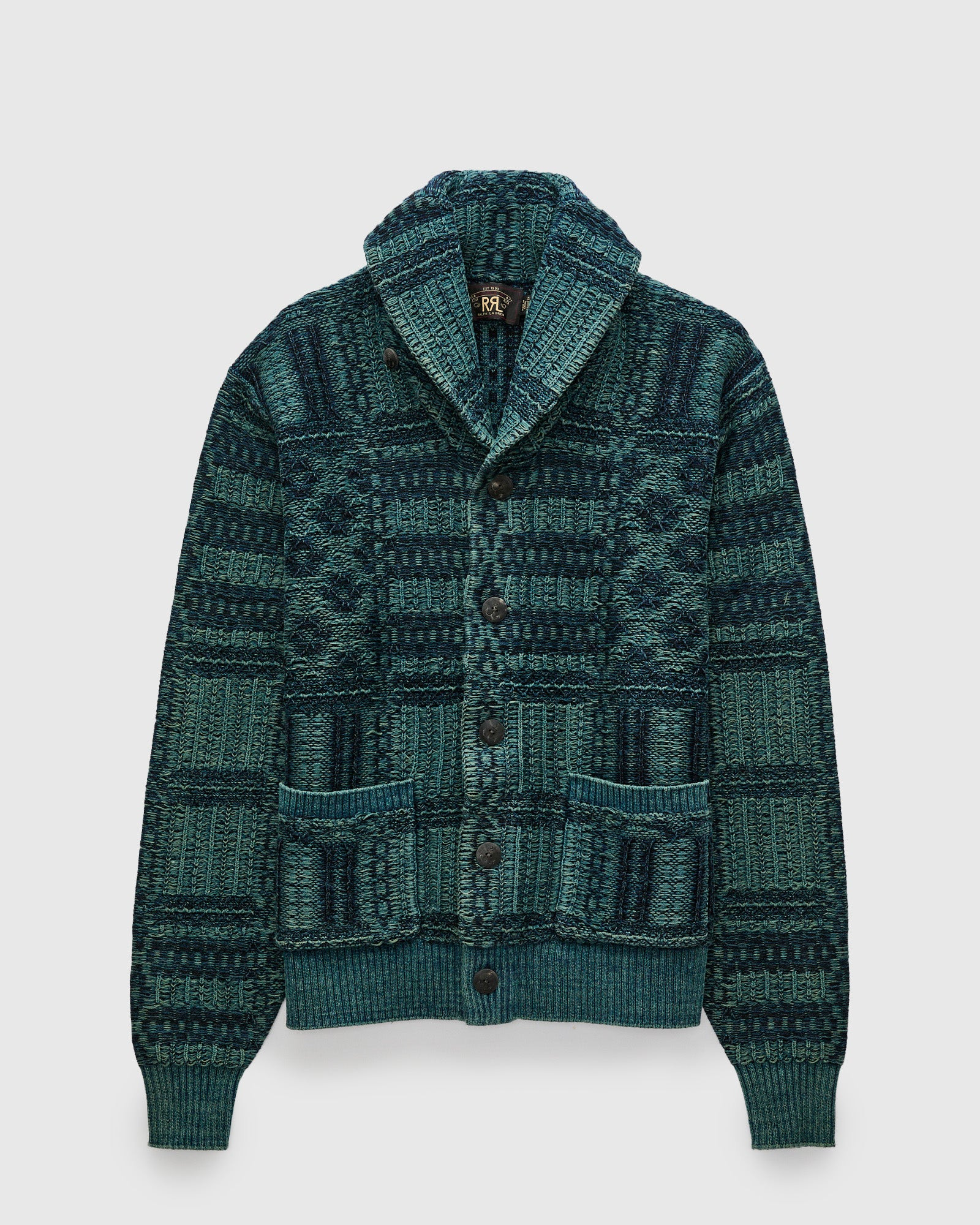 Inspired by 1960s overshot blankets, this special cotton cardigan is knit using a ladder-back float-jacquard technique to create a highly textured effect. The cardigan is knit using a variety of indigo yarns that have been dyed at different rates to create a multi-color effect when used together. Equipped with oversized horn buttons and finished with two pockets at the waist. - Indigo-dyed - Textured cotton slub yarn - Shawl collar design with button placket - Anchor-etched horn buttons - Elongated sleeves - Two pockets at waist - Rib-knit cuffs and hem - 100% cotton - Made in China