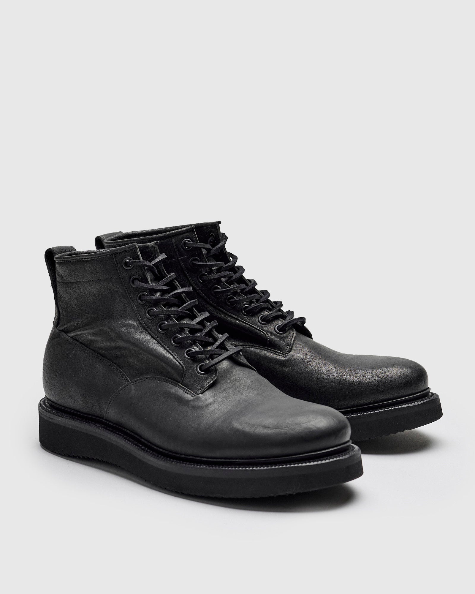 Originally designed for the Japanese market, Viberg's Scout Boot references hunting boots from the maker's storied archives. Built on Viberg's 2030 last, a classic silhouette featuring a sleek-low profile, elongated toe shape and standard width designed to fit most feet. This iteration features Maryam Tannery's vegetable tanned Washed Kangaroo leather, tanned in Santa Croce sull'Arno Italy. The Washed Kangaroo leather is a lightweight full-grain leather with a supple buttery feel while still retaining a structured hand feel and durability. The leather's waxy finish and high pull-up allow for a slow, rich development. Fitted with Vibram oil resistant Black Wedge outsoles for a comfortable cushioned step. - 2030 Last - Washed Kangaroo leather from Maryam Tannery, Italy - Gunmetal black eyelets - Heel pull tab - 360 degree storm welt - Channeled Insole Goodyear welt construction - Vibram Casual 2021 Wedge sole - Handcrafted in Victoria, B.C., Canada