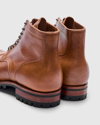 Built on Viberg's 2040 last, a military silhouette featuring a low heel and slight toe contour. Originally crafted in 1931, the Service Boot is a timeless design inspired by standard issue military boot patterns. The boots have a minimalist design, allowing for the raw materials and construction to speak for itself. This iteration is cut from Horween's Cypress leather, a workboot leather nourished heavily with waxes and oils for a rich pull-up and smooth feel. The leather promises a rich patina with wear over time, darkening in high-wear areas while slowly conforming to foot shape. Finished with a brogue cap toe, Commando outsole, and resoleable stitchdown construction. - 2040 Last - Natural Cypress leather from Horween Tannery, Chicago, USA - 9 caramel brass eyelets - Brogue cap toe - Gusseted tongue - Stitchdown construction - Goodyear commando sole - Handcrafted in Canada