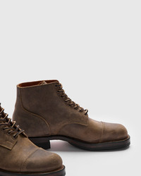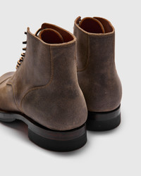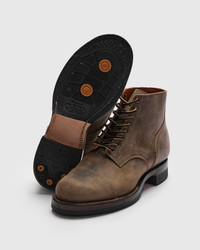 Built on Viberg's 2040 last, a military silhouette featuring a low heel and slight toe contour. Originally crafted in 1931, the Service Boot is a timeless design inspired by standard issue military boot patterns. The boots have a minimalist design, allowing for the raw materials and construction to speak for itself. This iteration features a rugged tannage courtesy of C.F. Stead of Leeds, United Kingdom. C.F. Stead's Commander is a rugged, heavyweight waxed leather that has been specially cured to shrink and tighten the fibre structure, resulting in an extremely tough, durable, water-resistant waxed suede. It features a very waxy touch and high pull-up that allows for slow development of color and texture. The boots are anchored with a Dr. Sole original half sole fused together with Viberg's signature stitch-down construction. Finished with tonal stitching, branded leather insole, and metal eyelets. - 2040 Last - Commander Waxed tannage from C.F. Stead of Leeds, United Kingdom - Full Vegetan lining - 8 AA Antique Brass Eyelets - Drilled cap toe - Natural Finish - Stitchdown construction - Dr. Sole original half sole - Includes round and flat wax laces - Handcrafted in Canada