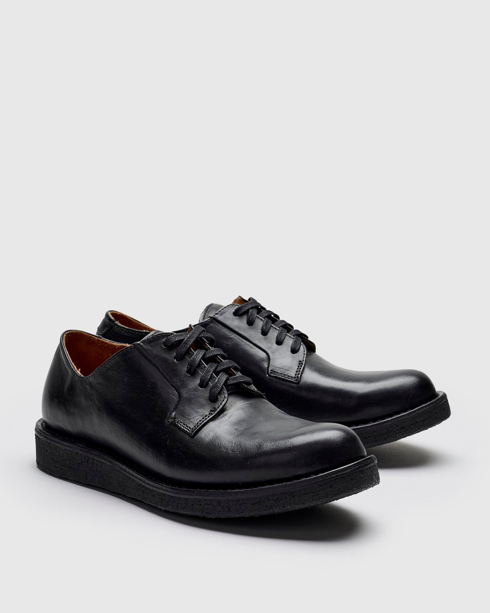 visvim presents their minimalist interpretation of the classic derby silhouette. The G.P.O Folk features a streamlined upper built around a single panel for a clean and seamless appearance. This iteration is made with a full grain vegetable-tanned horsehide and stacked black crepe sole. Constructed with a natural leather liner and encapsulating 360 degree welt, each shoe comes handmade from master craftsmen. - vegetable tanned Italian horsehide leather - Deerskin tab - 360 degree welt construction - Stacked crepe sole - Natural cork footbed - Waxed cotton laces - Natural linen dust bag - Made in China - 0125102002008