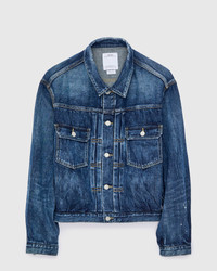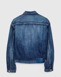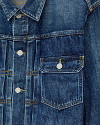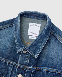 visvim's Social Sculpture 101X JKT is crafted from the brand’s proprietary 13oz Japanese selvedge denim, treated with their signature "Damaged" processing. Cut in a classic Type II silhouette, the jacket offers a traditional fit with a slightly cropped length and a roomy upper block. The "DMGD-1010" treatment recreates authentic whiskering and distressing, giving the jacket a naturally worn-in look. Finished with dual chest pockets, hidden zipper waist pockets, custom hardware, a natural indigo-dyed buckskin patch, and red selvedge detailing. - 13oz proprietary Japanese selvedge denim - "DMGD-1010" distressing treatment - Hidden zipper waist pockets - Dual chest pockets - Custom hardware - Natural indigo-dyed b uckskin patch - Red selvedge ID - 100% cotton - Made in Japan - SS 101X JKT DMGD-1010 - Style No: 0125105006003