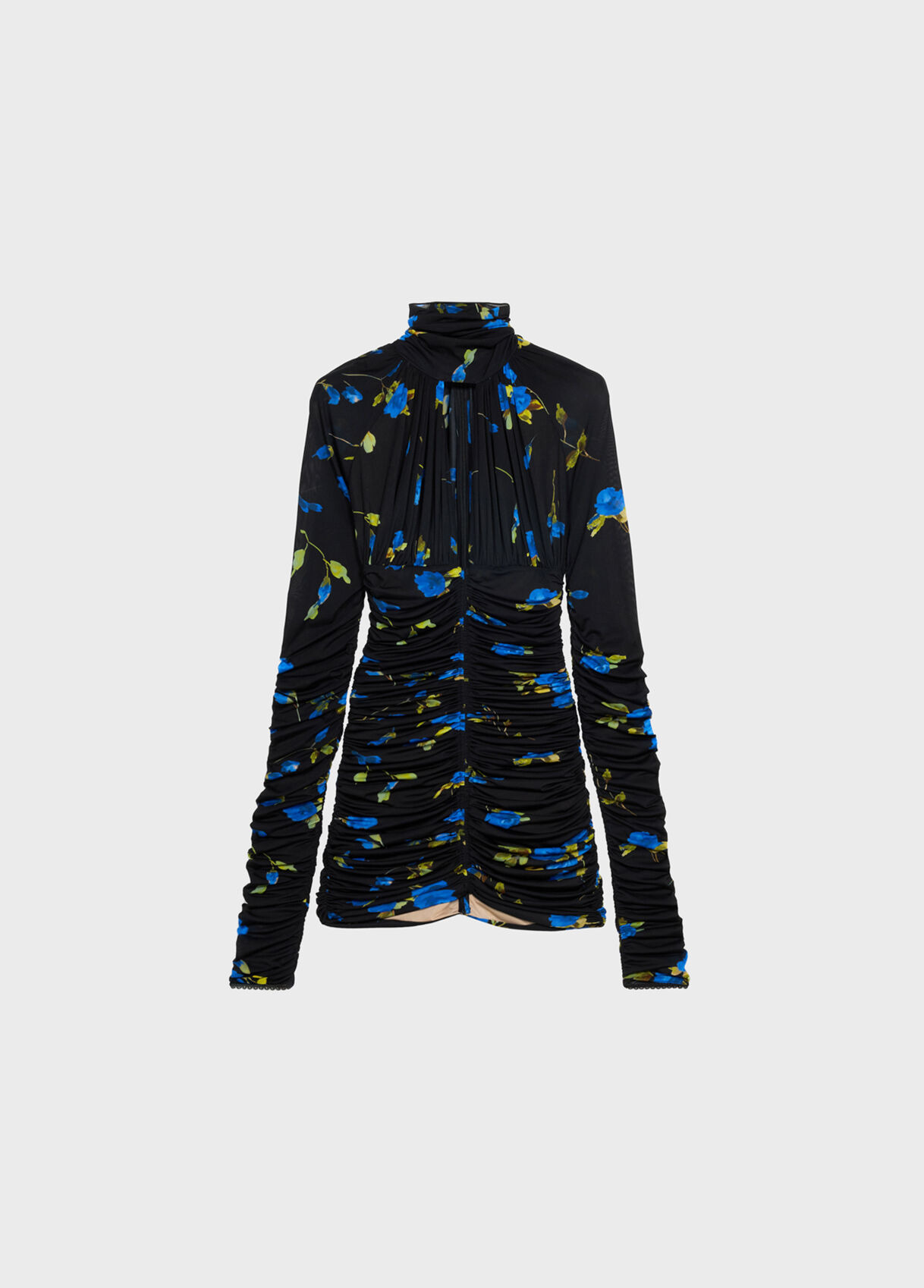 Second skin jersey mini dress with rose print, high neck, cut-out at the neckline, and ruffles on the bodice and sleeves. - Second skin jersey - Ruffled bodice and sleeves - High neckline - Neckline cut-out - Long sleeves - Trimmed open cuffs - Zip closure at back - Fully lined - Mini length - Body-hugging fit - Made in Italy DETAILS To find the correct size for you, please consult the Size Guide. Composition: Main fabric: 90% polyamide, 10% elastane; Main lining: 75% polyamide, 25% elastane; Trimmings: 80% polyamide, 20% elastane Wash delicate cycle max 30°C; Do not bleach; Do not tumble dry; Iron at low temperature - no steam; Dry clean with tetrachloroethylene or hydrocarbons - gentle cycle; Use a mild detergent; Wash inside out; Gentle spin; Do not iron lining; Iron inside out