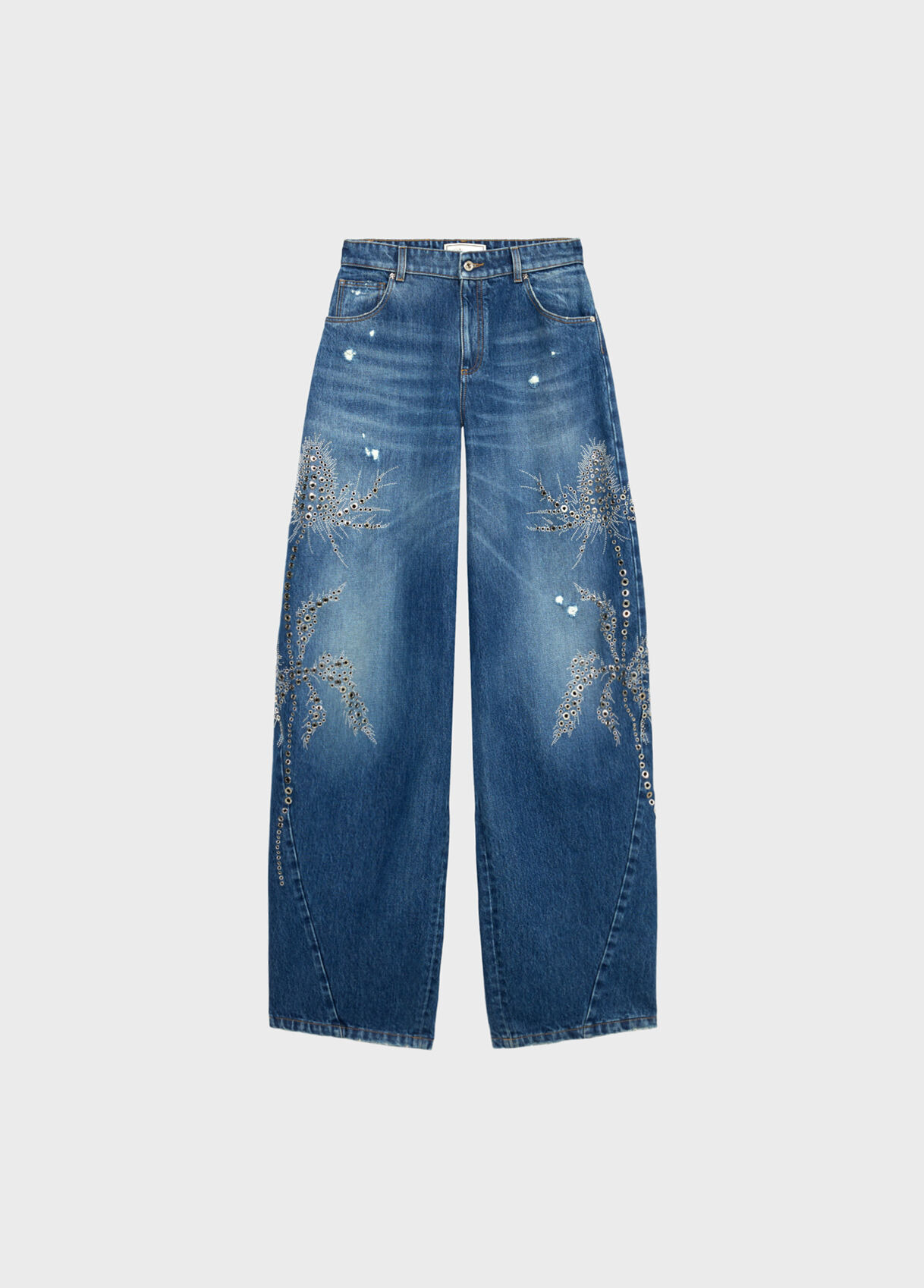 baggy five-pocket jeans with stud and metal eyelet embroidery. - Medium wash denim - Stud and metal eyelet embroidery - Baggy cut - Five pockets - Belt loops - Button and zip closure - Oversized fit DETAILS To find the correct size for you, please consult the Size Guide. Composition: Main fabric: 100% cotton; Fabric 2: 65% polyester, 35% cotton; Embroidery: 100% aluminium Hand wash - room temperature; Do not bleach; Do not tumble dry; Iron at low temperature - no steam; Do not dry clean; Wash separately; Do not expose to direct heat; Do no leave in water; Wash inside out; Do not twist or squeeze; Iron inside out