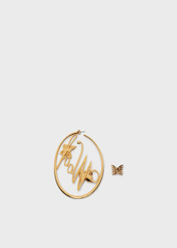 Pair of brass earrings: one butterfly earring and one hoop earring with “woof” lettering. - Brass - Hoop style - Woof lettering, roses and butterflies - Pierced earring style - Clasp closure with pin DETAILS Composition: Accessory: 100% brass