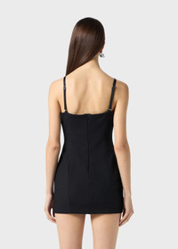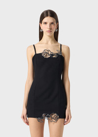 Laser-cut embroidered roses with glass rhinestones illuminate the neckline and hem of this mini dress in cady crepe. - Cady crepe - Laser-cut rose embroidery on neckline and hem - Glass rhinestone decorations - Straight neckline - Sleeveless cut - Shoulder pads - Low-cut back - Zip closure at back - Mini length - Body-hugging fit - Made in Italy DETAILS To find the correct size for you, please consult the Size Guide. Composition: Main fabric: 96% polyester, 4% elastane; Main lining: 100% polyester; Embroidery: 100% glass Hand wash - room temperature; Do not bleach; Do not tumble dry; Iron at low temperature - no steam; Dry clean with tetrachloroethylene or hydrocarbons - gentle cycle; Do not expose to direct heat; Wash inside out; Wash in a mesh bag; Iron inside out; Do not iron trims