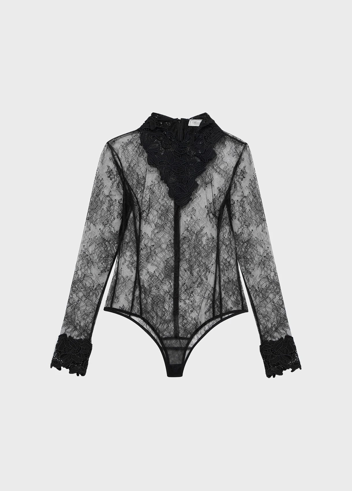 lingerie effect for the chantilly lace body with macrame applications on the neckline and wrists. - Chantilly lace - Macrame lace applications on the neckline and wrists - Long sleeves - Zip closure at the back - Body-hugging fit - Made in Italy DETAILS To find the correct size for you, please consult the Size Guide. Composition: Main fabric: 50% polyamide, 50% viscose; Trimmings: 100% polyester Do not wash; Do not bleach; Do not tumble dry; Iron at low temperature - no steam; Dry clean with tetrachloroethylene or hydrocarbons - gentle cycle; Clean inside out; Iron inside out