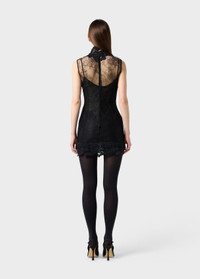 lingerie inspiration for the short dress made of see-through chantilly lace with macrame lace applications on the decollete, on the cups, and at the bottom. - See-through chantilly lace - Macrame lace applications - Sleeveless - Zip closure at the back - Removable underdress - Mini length - Regular fit - Made in Italy DETAILS To find the correct size for you, please consult the Size Guide. Composition: Main fabric: 50% polyamide, 50% viscose; Trimmings: 100% polyester; Slip: 100% polyester Do not wash; Do not bleach; Do not tumble dry; Iron at low temperature - no steam; Dry clean with tetrachloroethylene or hydrocarbons - gentle cycle; Clean inside out; Iron inside out