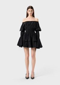 short dress in shiny technical fabric with ruffle design, off-shoulder neckline, gathered detail at the waist and on the sleeves. - Shiny technical fabric - Ruffle design - Wide neckline that can also be off-shoulder - Long puff sleeves with gathering - Gathered details at the waist - Wide hem - Inner lining - Mini length - Regular fit - Made in Italy DETAILS To find the correct size for you, please consult the Size Guide. Composition: Main fabric: 52% polyester, 48% cotton; Main lining: 100% polyamide Wash delicate cycle max 30°C; Do not bleach; Do not tumble dry; Iron at low temperature - no steam; Dry clean with tetrachloroethylene or hydrocarbons - gentle cycle; Wash inside out; Gentle spin; Iron inside out