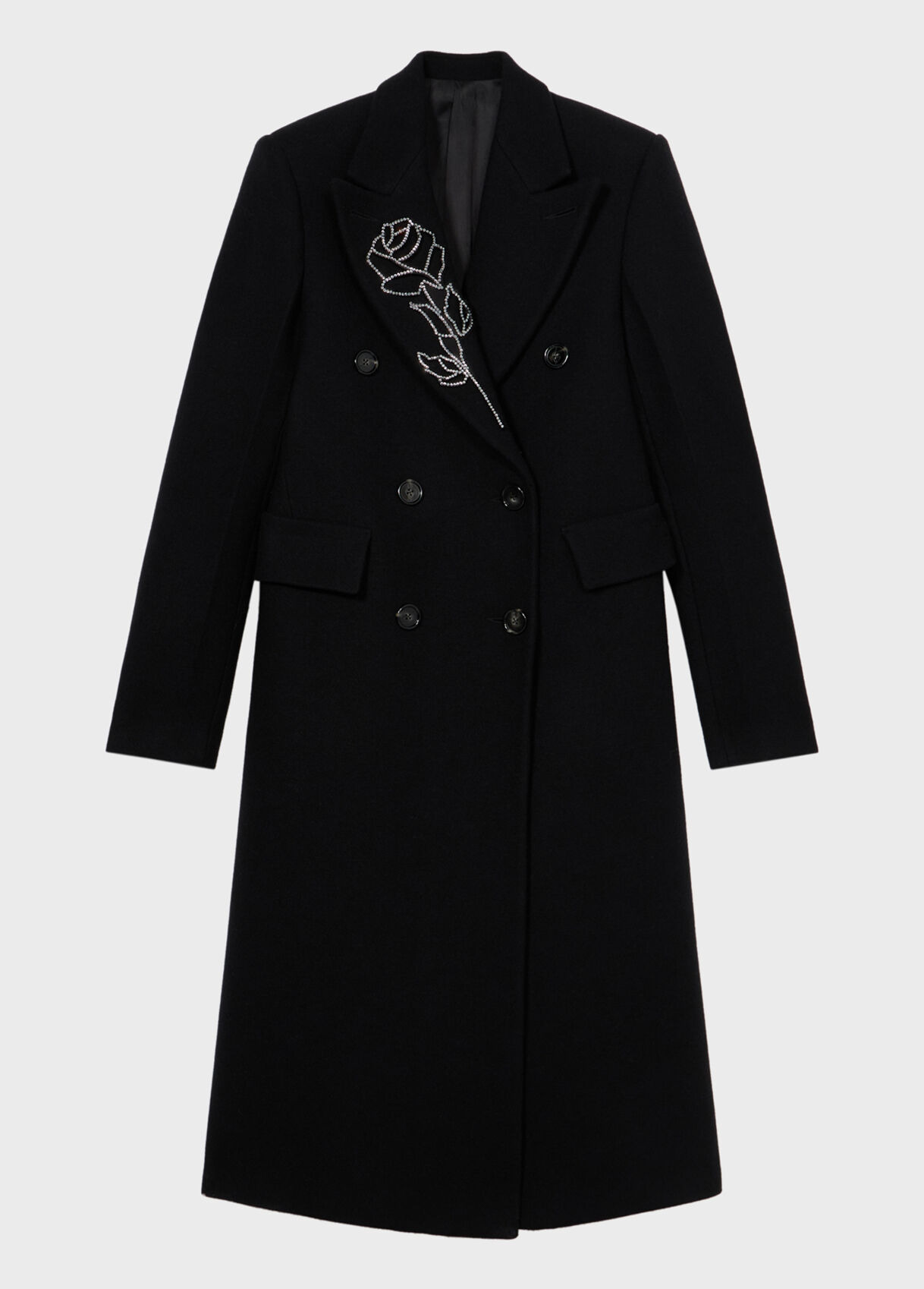 Double-breasted coat in straight-cut wool cloth with glass rhinestone rose embroidery on one lapel. - Wool felt - Glass rhinestone rose embroidery on one lapel - Double-breasted style - Straight line - Collar - Lapels - Flap pockets - Long sleeves - Buttoned cuffs - Back vent - Midi-length - Regular fit - Made in Italy DETAILS To find the correct size for you, please consult the Size Guide. Composition: Main fabric: 70% wool, 30% polyamide; Main lining: 52% acetate, 48% viscose; Fabric 2: 50% viscose, 50% wool; Embroidery: 100% glass Do not wash; Do not bleach; Do not tumble dry; Iron at low temperature - no steam; Dry clean with tetrachloroethylene or hydrocarbons - gentle cycle; Protect trims when cleaning; Clean inside out; Iron inside out; Do not iron trims