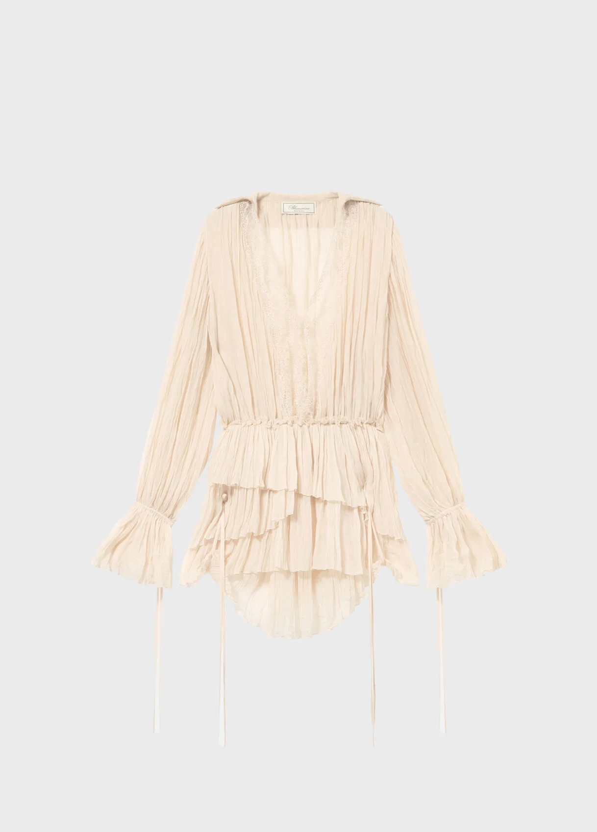 Short pleated viscose georgette dress with a V-neck trimmed with scalloped Chantilly lace, full sleeves with corolla cuffs, a ruched waist, and overlapping ruffles on the hem. - Pleated viscose georgette - V-neck with scalloped Chantilly lace insert - Long, full sleeves - Corolla cuffs with laces - Elasticated waist with ruching - Asymmetrical hem with overlapping ruffles - Collar on the back - Mini length - Regular fit - Made in Italy DETAILS Composition: External fabric: 100% Viscose; Lace: 100% Polyamide Do not wash; Do not bleach; Do not tumble dry; Do not iron; Dry clean with tetrachloroethylene or hydrocarbons - gentle cycle; Clean inside out; Clean in mesh bag