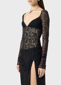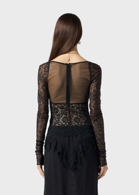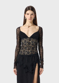See-through lace blouse with sweetheart neckline, lined cups in fabric, long sleeves, and tulle back. - See-through lace - Sweetheart neckline with trimming - Fabric lined cuffs - Long sleeves - Tulle back - Zip closure at back - Body-hugging fit - Made in Italy DETAILS To find the correct size for you, please consult the Size Guide. Composition: Main lining: 75% polyamide, 25% elastane; Trimming: 80% polyamide, 20% elastane; Lace: 80% polyamide, 20% elastane; Tulle: 90% polyamide, 10% elastane; Lace 2: 50% polyamide, 50% viscose Do not wash; Do not bleach; Do not tumble dry; Iron at low temperature - no steam; Dry clean with tetrachloroethylene or hydrocarbons - gentle cycle; Wash inside out; Do not iron lining; Iron inside out
