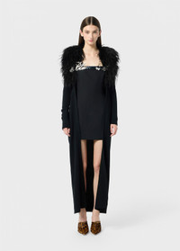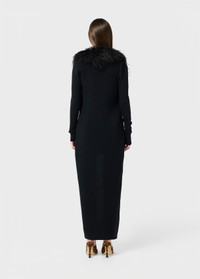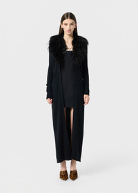 Long ribbed wool cardigan with cashmere goat fur collar and single-button closure. - Ribbed wool - Cashmere goat fur collar - Long sleeves - One-button closure - Ankle-length cut - Body-hugging fit - Made in Italy DETAILS To find the correct size for you, please consult the Size Guide. Composition: Main lining: 100% polyester; Padding (Fibres): 100% polyester; Yarn 1: 100% wool Do not wash; Do not bleach; Do not tumble dry; Iron at low temperature - no steam; Dry clean with tetrachloroethylene or hydrocarbons - gentle cycle; Protect buttons when dry cleaning; Remove detachable accessories before cleaning; Wash inside out