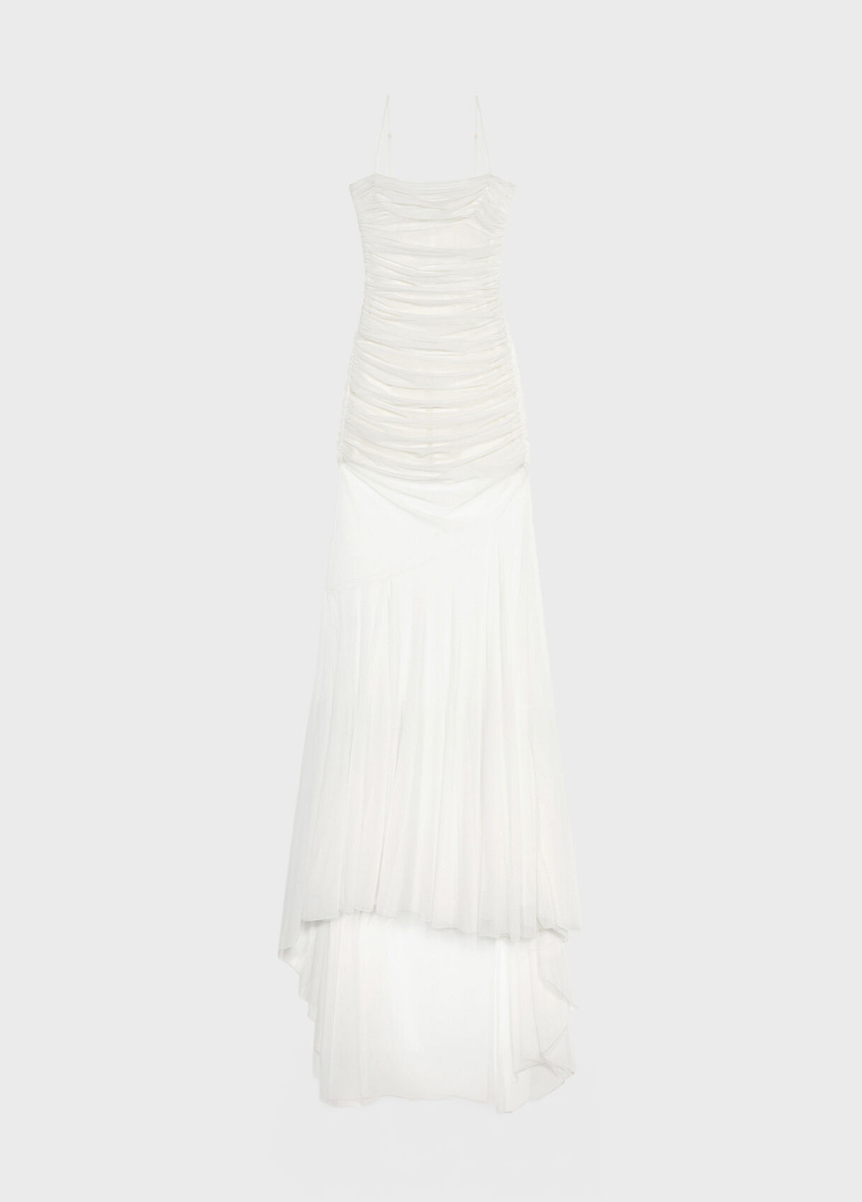 Corset top with ruffles and boning for long tulle dress with straps, straight neckline, full see-through skirt with diagonal flounce, low backline, and short train. - Tulle - Double-layered tulle bodice with boning and pleats - Straight neckline - Sleeveless cut - Shoulder pads - Sheer full skirt with flounce - Low-cut back - Zip closure at back - Fully lined - Short train - Floor-length - Body-hugging fit - Made in Italy DETAILS To find the correct size for you, please consult the Size Guide. Composition: Main fabric: 90% polyamide, 10% elastane; Main lining: 75% polyamide, 25% elastane; Secondary lining: 71% polyamide, 29% elastane Wash delicate cycle max 30°C; Do not bleach; Do not tumble dry; Iron at low temperature - no steam; Dry clean with tetrachloroethylene or hydrocarbons - gentle cycle; Wash inside out; Do not iron lining; Iron inside out