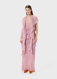 Long pleated viscose georgette dress with a Chantilly lace insert on the neckline, cap sleeves, loose ruffles, ruches and flounces on the waist, and a slit on the hem. - Pleated viscose georgette - V-neckline with Chantilly lace insert - Cap sleeves - Loose flounces - Ruches and flounces on the waist - Short slit on the hem - Ruffle on the back - Floor length - Regular fit - Made in Italy DETAILS Composition: External fabric: 100% Viscose; Lace: 100% Polyamide Do not wash; Do not bleach; Do not tumble dry; Do not iron; Dry clean with tetrachloroethylene or hydrocarbons - gentle cycle; Clean inside out; Clean in mesh bag