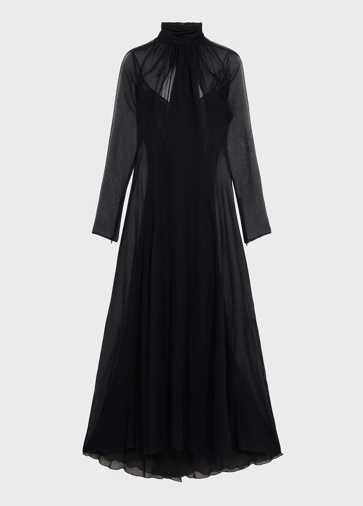 Ankle-length silk georgette dress with high collar, scarf, gathered detail at the front, and cut-out back neckline. - Silk georgette - High collar - Scarf - Gathered detail at the front - Long sleeves - Cut-out back neckline - Removable underdress - Ankle-length - Regular fit - Made in Italy DETAILS To find the correct size for you, please consult the Size Guide. Composition: Main fabric: 100% silk; Slip: 100% polyester Do not wash; Do not bleach; Do not tumble dry; Iron at low temperature - no steam; Dry clean with tetrachloroethylene or hydrocarbons - gentle cycle; Wash inside out; Iron inside out