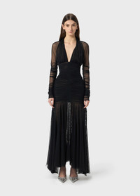 Stretch tulle midi dress with ruffles on the bodice and sleeves and a full skirt with asymmetrical hem. - Stretch stretch - Ruffles on the bodice - V-neck - Long sleeves with ruffles - Trimmed open cuffs - Flared skirt with asymmetrical hem - Zip closure at back - Fully lined - Midi-length - Body-hugging fit - Made in Italy DETAILS To find the correct size for you, please consult the Size Guide. Composition: Main fabric: 90% polyamide, 10% elastane; Main lining: 75% polyamide, 25% elastane; Trimmings: 80% polyamide, 20% elastane Wash delicate cycle max 30°C; Do not bleach; Do not tumble dry; Iron at low temperature - no steam; Dry clean with tetrachloroethylene or hydrocarbons - gentle cycle; Wash inside out; Do not iron lining; Iron inside out