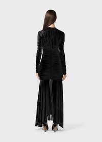 Midi dress in viscose crepe jersey with gathered bodice and sleeves and flared skirt with asymmetrical hem. - Viscose crepe jersey - Ruffled bodice and sleeves - V-neck - Long sleeves - Trimmed open cuffs - Flared skirt with asymmetrical hem - Zip closure at back - Midi-length - Body-hugging fit - Made in Italy DETAILS To find the correct size for you, please consult the Size Guide. Composition: Main fabric: 100% viscose; Main lining: 80% polyamide, 20% elastane; Trimmings: 75% polyamide, 25% elastane Wash delicate cycle max 30°C; Do not bleach; Do not tumble dry; Iron at low temperature - no steam; Dry clean with tetrachloroethylene or hydrocarbons - gentle cycle; Dry flat in shade; Wash inside out; Gentle spin; Do not iron lining; Iron inside out
