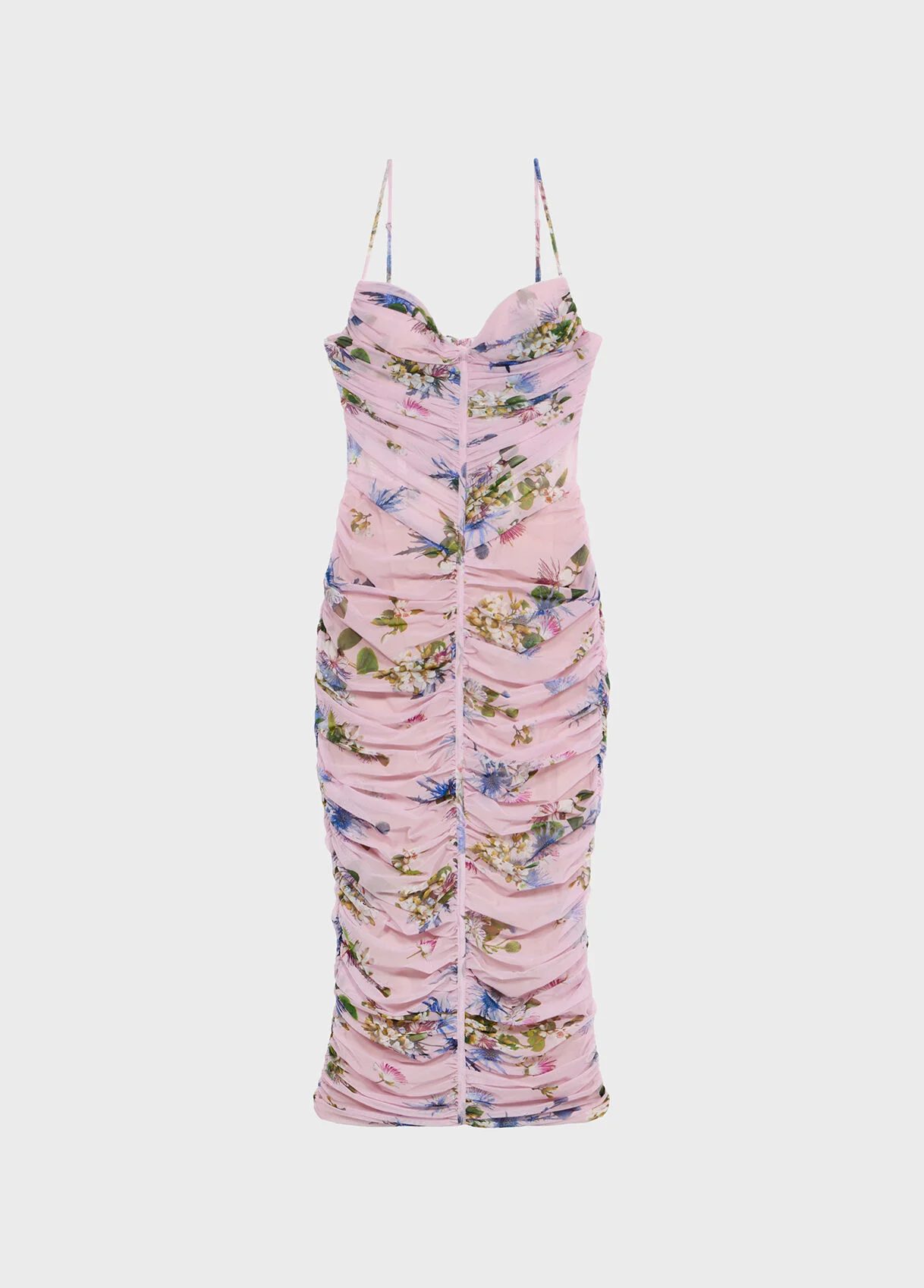stretch tulle dress printed with gathered pattern on bustier with shaped cups, boning and trim profiles. - Nylon tulle with gathered patterns - Bouquet print - Sleeveless - Shaped neckline and trimmed in trimming - Sleeveless - Straps - Zip closure at the back - Inner lining - Midi length - Body-hugging fit - Made in Italy DETAILS To find the correct size for you, please consult the Size Guide. Composition: Main fabric: 94% polyamide, 6% elastane; Main lining: 75% polyamide, 25% elastane; Fabric 2: 71% polyamide, 29% elastane; Trimmings: 80% polyamide, 20% elastane Wash delicate cycle max 30°C; Do not bleach; Do not tumble dry; Do not iron; Dry clean with tetrachloroethylene or hydrocarbons - gentle cycle; Dry flat in shade; Wash inside out; Gentle spin